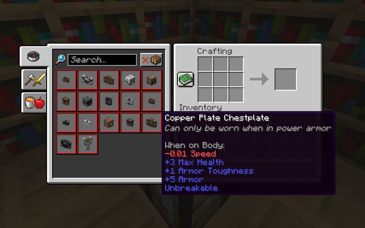 Currently, in the Power Armor datapack, there are three sets of armor that are uncraftable; which means the only way to get these sets of armor is with commands. These sets of armor will most likely be fully added to the game at some point in time.